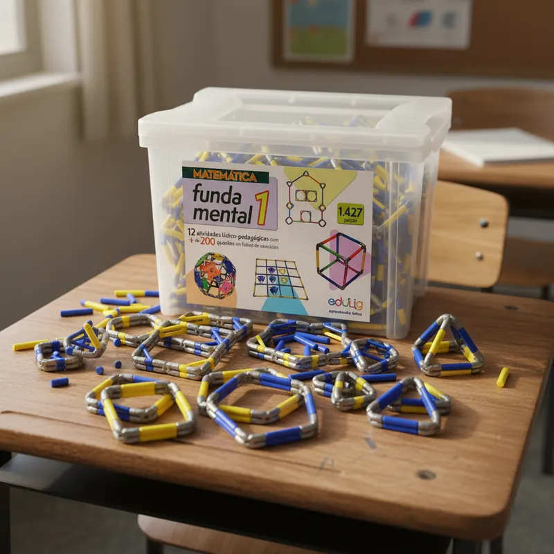 O Kit Educativo Edulig Matemática Fundamental cria interatividade e engajamento nas aulas de matemática. Com 1.918 peças rígidas e conexões flexíveis, este kit certificado pelo INMETRO como brinquedo para atividades intelectuais oferece jogos, problemas e exercícios, com 12 atividades e mais de 200 exercícios individuais e em grupo