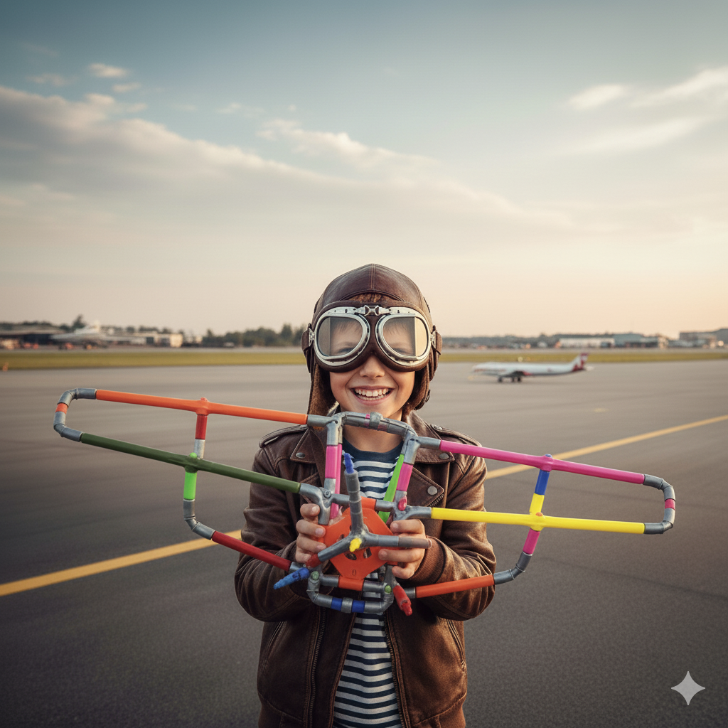 Com 85 varetas rígidas e conexões flexíveis, o avião ganha forma em uma estrutura leve e surpreendente, com 36 cm de largura, 30 cm de comprimento e 15 cm de altura. Durante a montagem, o participante exercita o raciocínio lógico, a percepção espacial e a coordenação motora, transformando o aprendizado em uma experiência concreta e envolvente.